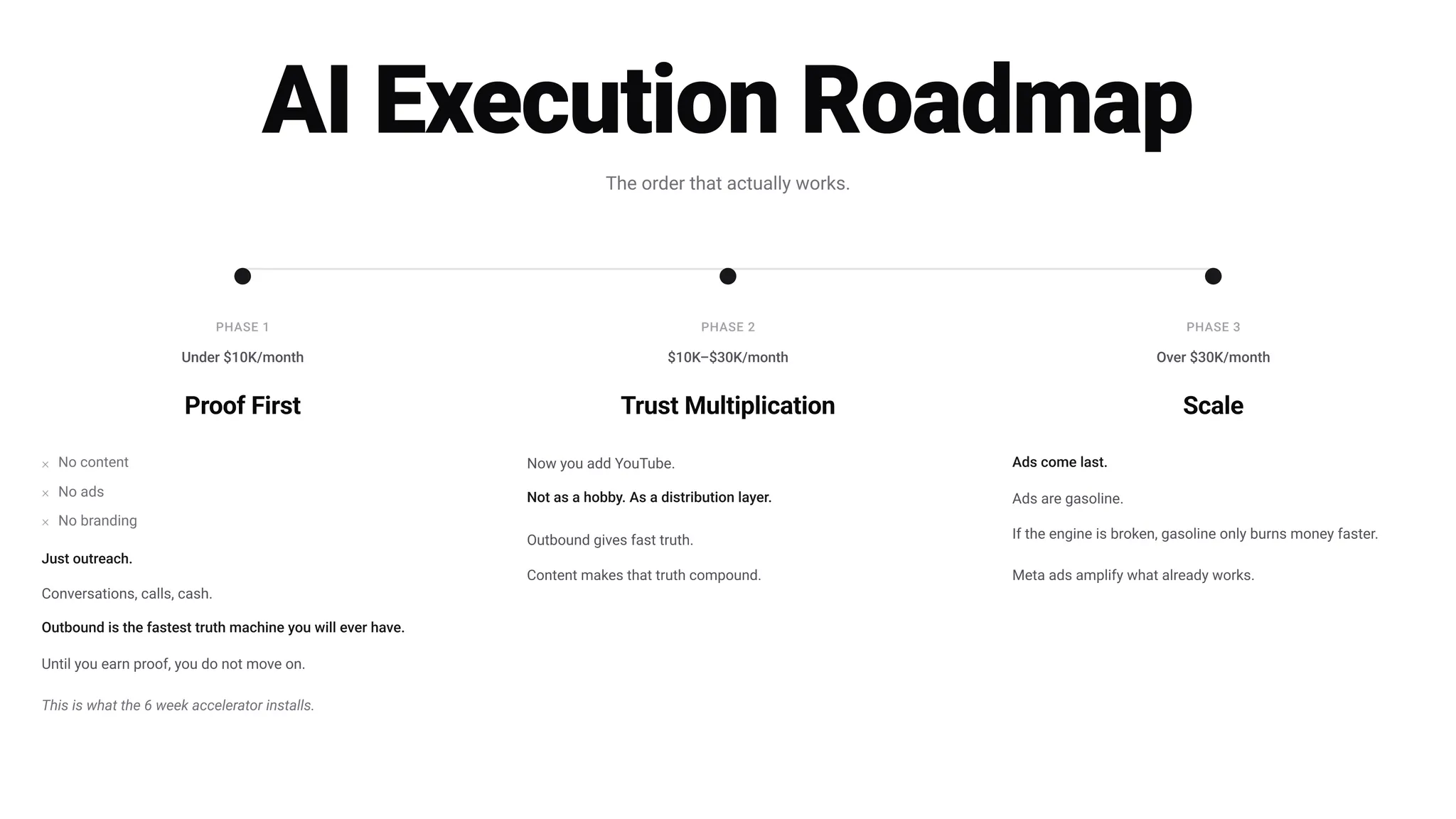 It is a 6-week execution cohort designed to kill learning addiction and force real market execution until revenue becomes real.
